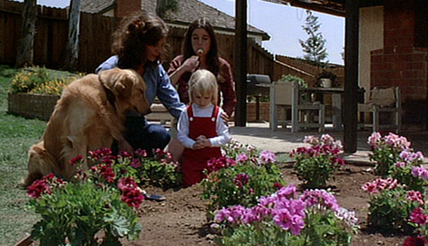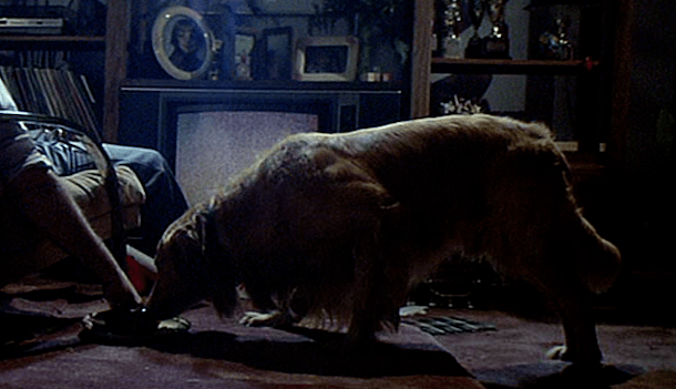 The camera then follows the dog up the stairs, where he checks on Mom Diane (JoBeth Williams) and then the three children, ending up in oldest daughter Dana (Dominique Dunne)’s room as she has a bag of chips in bed with her — which the dog happily finishes for her.