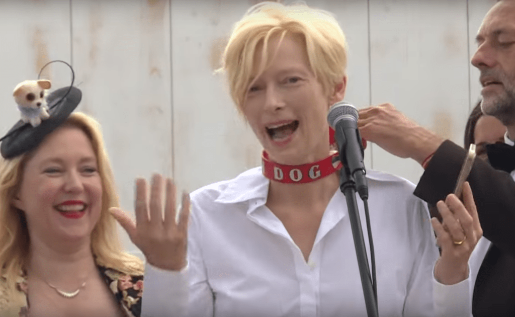 Swinton was on hand to accept the award in person on July 17 with one of her dogs, but she decided to wear the honorary Palm Dog collar herself.