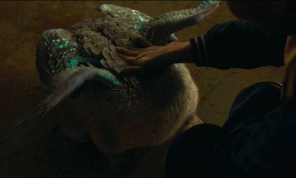 The cuddly creature proves to be their key to gaining entry to the elusive land of Ta Lo, where he happily reunites with his fellow winged flock. And plays with the two Fu Dogs, who are about 10 times his size.