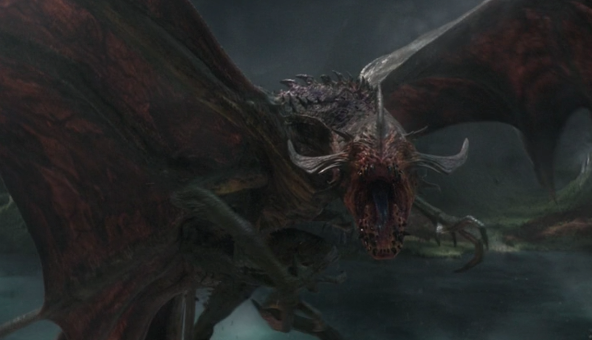 Wenwu attacks the gate of its hillside prison, mistakenly believing he is freeing his dead wife. Once freed, it begins feasting on souls, having already been been fed by its smaller minions, aka soul suckers. It nearly defeats the Great Protector, but, like Maleficent’s devilish dragon in Sleeping Beauty or Tolkien’s dragon Smaug, is felled by a well-aimed weapon.