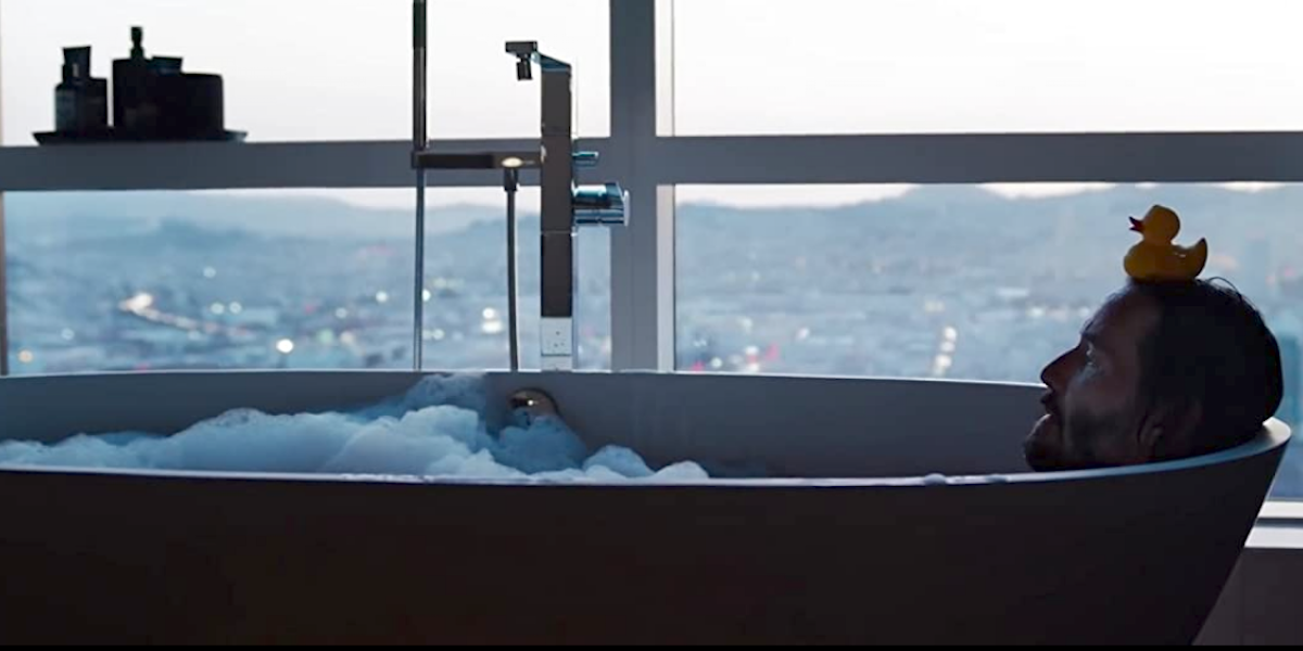 In a humorous shot, Tom is taking a bath and has placed the yellow rubber duckie on his head.