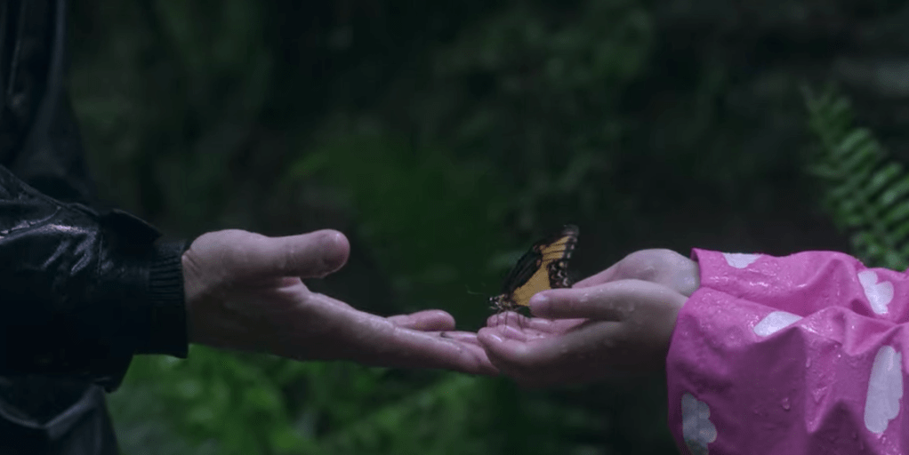 When she suggests the butterfly might just be tired, he agrees and puts it on a tree branch to “rest.” Vee goes behind a tree to pee, but when she looks back, Philip is holding it in the palm of his hand again. He looks at it for a moment, then crushes it in his hand. She gasps, horrified, and from then on, regards her father with caution.