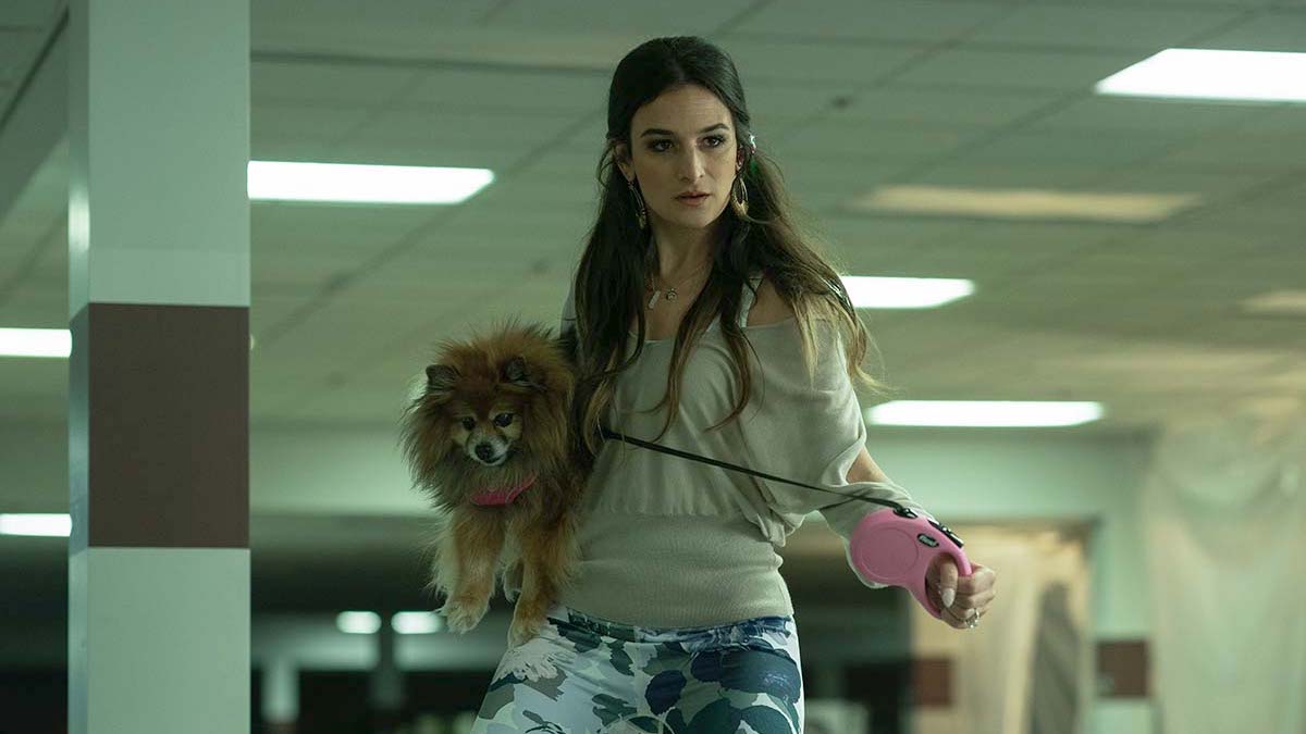 In another scene, Jenny Slate’s character, who is also battling Evelyn, wields her leashed-up pet Pomeranian like a weapon. When the leash is snipped, the dog (which now appears to be a stuffed animal) is sent flying and is never seen again.